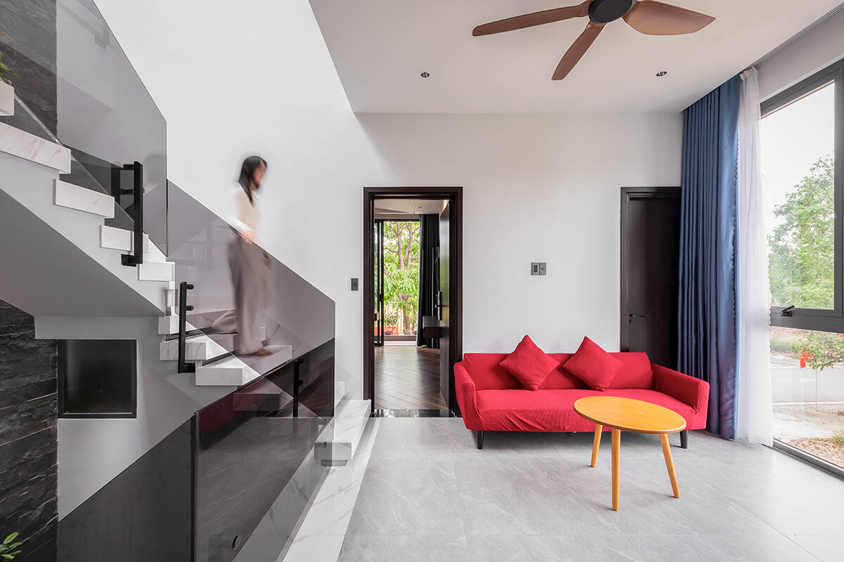 Cảm giác thanh thoát: Không gian cầu thang không chỉ thông thoáng mà còn trở nên ấn tượng hơn nhờ sự tinh tế của lớp kính xám khói.